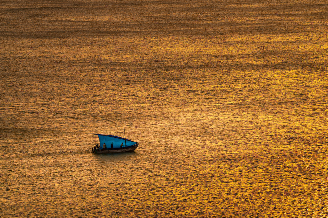 As the first rays of dawn poured over the horizon line, the sea blazed a brilliant gold. The blue sail of a lone dhow unfurled in the morning breeze and carved its way through the molten waves.